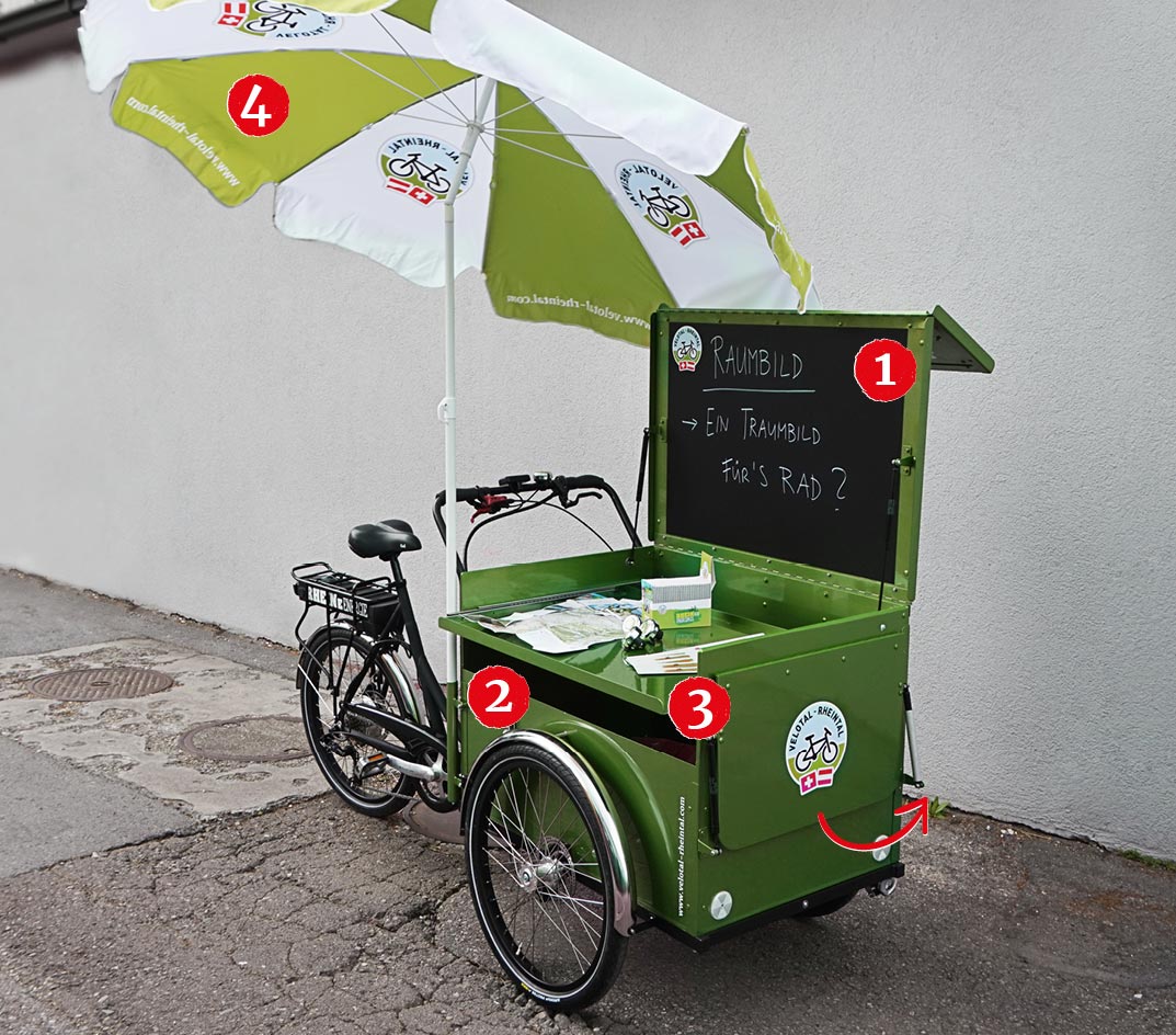 Das Rad verfügt über diverse Ablageflächen für Giveaways, Flyer, Prospekte etc.
